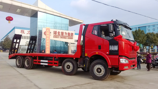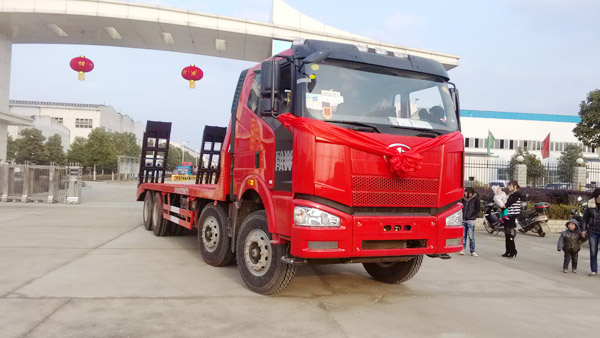 解放J6前四后八平板運(yùn)輸車采用解放錫柴330EGR馬力發(fā)動(dòng)機(jī)改裝,帶制動(dòng)。
