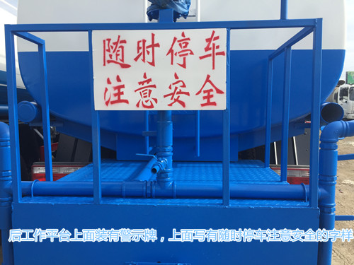 東風(fēng)多利卡D9灑水車罐體下面有灑水車進(jìn)水.出水以及連同的管道,管道排布整齊,一眼就能看清走向,管道到采用一次性成型鋁合金管。防腐能力強(qiáng),不生銹,管道外接口處有防護(hù)欄,紅白兩色非常明顯,后工作平臺(tái)上面也有紅白兩色的防護(hù)欄,防護(hù)欄上面裝有后尾燈,和上牌架,后工作平臺(tái)上裝有簡(jiǎn)易的爬梯,使用耐用,后工作平臺(tái)上面裝有警示牌,上面寫有隨時(shí)停車注意安全的字樣。