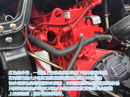 東風(fēng)多利卡D9灑水車,采用東風(fēng)玉柴160馬力發(fā)動(dòng)機(jī),六個(gè)缸的發(fā)動(dòng)機(jī)動(dòng)力是非常強(qiáng)勁的,不論是同品牌下的發(fā)動(dòng)機(jī)都沒(méi)有這款馬力強(qiáng)勁,結(jié)對(duì)時(shí)同款車型里的扛把子,無(wú)車能別。紅色的外表,一眼看上去就是事東風(fēng)旗下的玉柴發(fā)動(dòng)機(jī),在對(duì)照它的大小和缸的數(shù)量就知道是玉柴160馬力的,論價(jià)值那也是非常經(jīng)濟(jì)實(shí)惠的,在同款里面也是最優(yōu)惠的價(jià)格,只要買的東風(fēng)多利卡D9灑水車的都說(shuō)這款發(fā)動(dòng)機(jī)馬力強(qiáng)勁,上坡很輕松,灑水效果非常好。