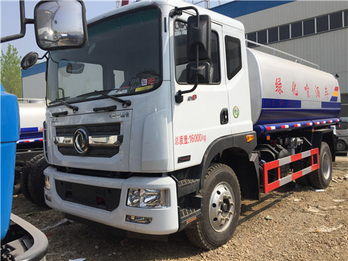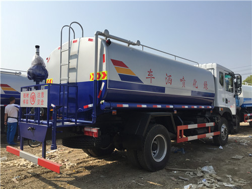 罐體用4MM碳鋼板制作,罐內(nèi)隔板具有防波作用,以減低汽車行駛時罐體液體的沖擊。整車帶一個專用灑水泵(垂直最大吸程6米),灑水寬度14米,射程28米。多功能灑水車配備2個前沖(噴)(能將路面泥巴、塵土、垃圾沖干凈);2個后灑(能均勻地將水灑在路面,一次灑水寬度14米)、2個側(cè)噴(花灑)(能均勻地將路旁綠化帶澆灌)、帶1個后工作平臺,平臺上安裝1個綠化灑水高炮(灑水炮可全方位旋轉(zhuǎn),可連續(xù)調(diào)成直沖狀、大雨、小雨、毛毛雨,霧狀可調(diào)節(jié)沖洗高大樹木),引水時間<5min,流量90m3/h。帶1個消防接頭,帶1個自流閥,1個過濾裝置、人性化爬梯及側(cè)防護欄,安裝灑水音樂喇叭。