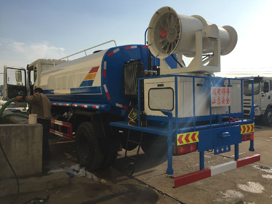 單橋可裝50-60米噴霧機(jī)車型,閃亮登場。整車型號(hào):DLQ5180GSSL5,底盤型號(hào)EQ5180GLVJ,東風(fēng)新款T5駕駛室,4500MM軸距,國五,康機(jī)190馬力,陜齒小八檔變速箱,帶原裝ABS。前沖后灑,后工作平臺(tái)帶高炮,右位花灑,側(cè)噴。前橋5噸,后橋10噸,10.00鋼絲胎。后平臺(tái)上加裝50米霧機(jī),水平射程50--55米,發(fā)電機(jī)組30KW,風(fēng)機(jī)電機(jī)11KW,水泵電機(jī)3KW。