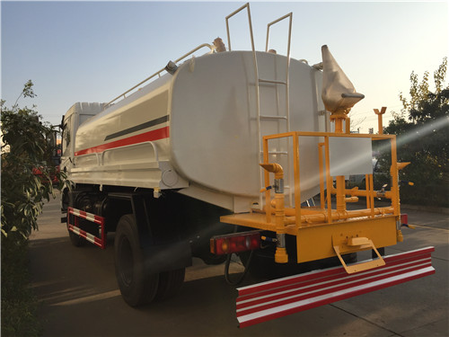 灑水車前裝有鴨形噴嘴或圓頭沖嘴,后面裝有圓柱開灑水噴嘴或蓮蓬頭噴嘴,后部有一工作平臺(tái),裝配有水炮。后部還可裝8個(gè)噴嘴(選裝)噴水器一般用于沖洗街道,起除塵和降溫作用,其噴水器可以用調(diào)節(jié)噴嘴螺紋的方法改變噴水器的噴灑方向和角度,高射水炮可以用于城鄉(xiāng)園林綠化及應(yīng)急消防。蓮蓬嘴可以澆落路中間噴水器沖起的灰塵,起到清潔空氣的作用。