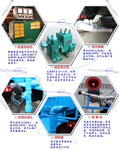改裝配置:罐體用4MM碳鋼板制作,罐內(nèi)隔板具有防波作用,以減低汽車行駛時(shí)罐體液體的沖擊。整車帶一個(gè)專用灑水泵(垂直最大吸程6米),灑水寬度14米,射程28米。多功能灑水車配備2個(gè)前沖(噴)(能將路面泥巴、塵土、垃圾沖干凈);2個(gè)后灑(能均勻地將水灑在路面,一次灑水寬度14米)、2個(gè)側(cè)噴(花灑)(能均勻地將路旁綠化帶澆灌)、帶1個(gè)后工作平臺(tái),平臺(tái)上安裝1個(gè)綠化灑水高炮(灑水炮可全方位旋轉(zhuǎn),可連續(xù)調(diào)成直沖狀、大雨、小雨、毛毛雨,霧狀可調(diào)節(jié)沖洗高大樹木),引水時(shí)間<5min,流量90m3/h。帶1個(gè)消防接頭,帶1個(gè)自流閥,1個(gè)過濾裝置、人性化爬梯及側(cè)防護(hù)欄,安裝灑水音樂喇叭。