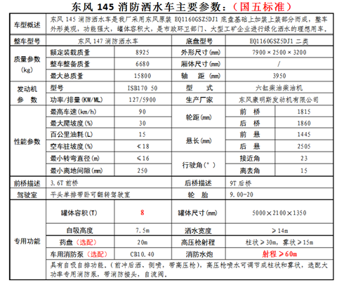 東風(fēng)145消防灑水車整車型號:CLW5165GPST5;發(fā)動機(jī):玉柴/康明斯;免征公告:有;罐體容積:12立方;環(huán)保公告:有;底盤型號:EQ1160GD5DJ;灑水寬度:20米;垂直吸程:8米;水炮揚(yáng)程:35米;軸距:3950mm;上戶噸位:9噸;排放標(biāo)準(zhǔn):國五;外形尺寸:7790X2500X3200;輪胎型號:9.00-20;側(cè)噴面積:>80平方米;后灑面積:>15平方米;水泵轉(zhuǎn)速:1180r/min。