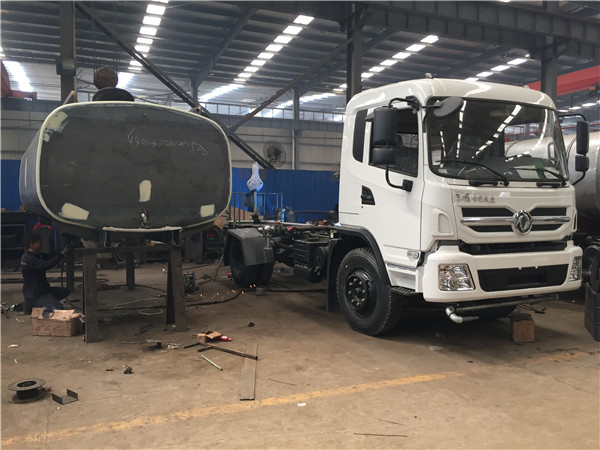 工人們把灑水車罐體和灑水車罐蓋進(jìn)行對(duì)接,吊車將灑水車罐體底座運(yùn)往罐體上方,工人正在焊接灑水車罐體底座,已焊接完成的碳鋼罐體
