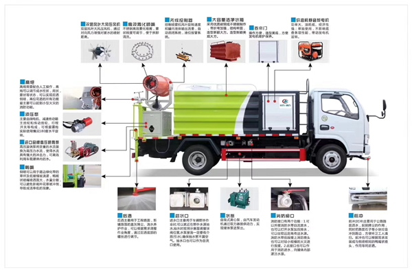 1、抑塵車(chē)前沖、前噴――前沖標(biāo)配的是三彎前沖噴頭,可任何調(diào)節(jié)灑水方向,常用于路面灑水,一般位于駕駛室前下方,主要噴射柱狀水流,射程14米,可將路面的垃圾及雜物沖至道路兩旁供清掃清潔,同時(shí)水遇到灰塵后結(jié)伽,防止車(chē)輛來(lái)往造成的揚(yáng)塵。也可選裝前噴噴頭,即用鴨嘴噴頭替代三彎前沖,噴出的水流呈扇形,像一把水鏟一樣,可以將路面沖洗得更為干凈,但相應(yīng)噴灑距離縮小,適合單邊道路的沖洗。