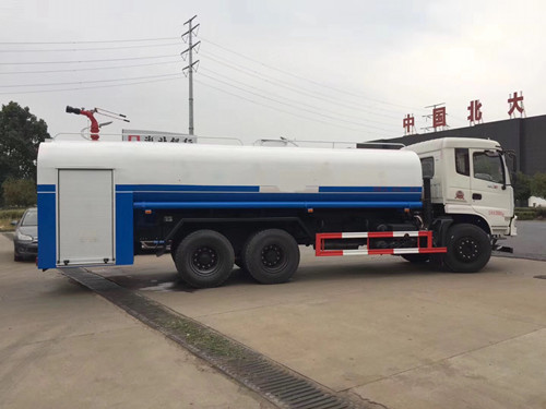 DLQ5254GQXLV5多功能灑水車,底盤型號(hào):EQ1250GLJ,新款御龍或T5駕駛室多功能灑水車、康機(jī)210馬力或玉柴240馬力發(fā)動(dòng)機(jī)、大八檔變速箱、280×80×(7+4)mm大梁、5噸前橋、10噸雙后橋、軸距4350+1300mm、輪胎11.00尼龍輪胎(或10.00鋼絲胎),配備30后置消防泵,24型消防炮,射程50-60米(后雙橋多功能灑水車(16-18噸)