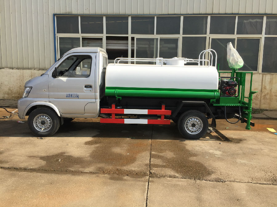 上裝配置:采用CH1035AQ24底盤改裝,水箱容積2立方,前沖后灑,側(cè)噴,罐體后帶工作平臺,平臺上安裝綠化灑水炮,灑水炮可全方位旋轉(zhuǎn),可連續(xù)調(diào)成直沖狀、大雨、小雨、毛毛雨,帶安全護(hù)欄,罐體材質(zhì)采用Q235碳鋼優(yōu)質(zhì)鋼板制作,罐體后部安裝汽油抽水泵,由抽水泵提供動力,泵可自吸自排,安裝過濾網(wǎng)。