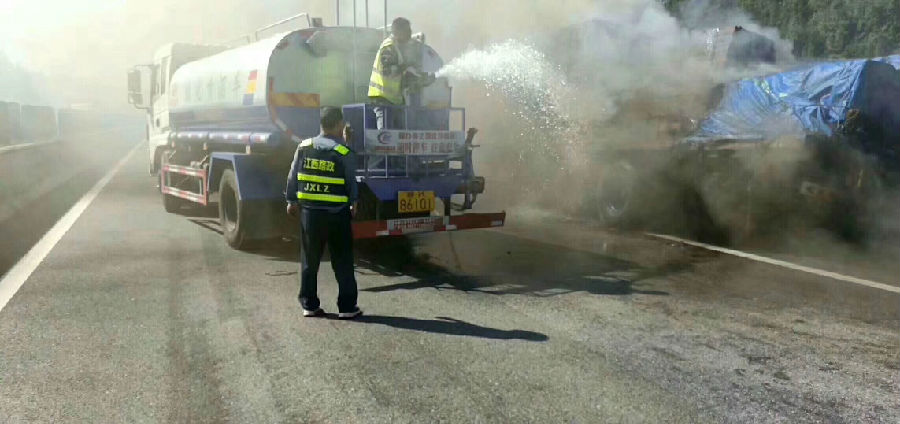 事情是這樣的,南昌的劉老板正在江西某告訴路上進(jìn)行樹木養(yǎng)護(hù)灌溉,(大家肯會(huì)問南昌的劉老板咋跑江西告訴上養(yǎng)護(hù)樹木了,那是應(yīng)為南昌的劉老板進(jìn)行招標(biāo),贏得了江西某告訴路段的養(yǎng)護(hù))今天剛好在告訴路上進(jìn)行樹木養(yǎng)護(hù),看見前方路段冒起了濃煙滾滾的,根據(jù)劉老板多年的經(jīng)驗(yàn),一看就知道前方發(fā)生了火災(zāi),這位劉老板不管是森林火災(zāi)還是車輛火災(zāi),都要前去滅火,(大家都知道火在不管的情況下,才能變成火災(zāi),只要把火在剛開始燃燒的時(shí)候給滅掉就不會(huì)發(fā)生火災(zāi))這劉老板一過去就看見一輛半掛車在燃燒,這是的火還不是非常大,還是非常危險(xiǎn)的,這劉老板不更具自己多年的經(jīng)驗(yàn)判定火勢(shì)自己的灑水車能把火給滅了,上去就加大馬力,利用灑水車水炮進(jìn)行滅火,經(jīng)過半小時(shí)火勢(shì)給控制住了,只剩濃煙,劉老板這不能松懈一定要等消防隊(duì)來啦交給消防隊(duì)才能放心,就在旁邊進(jìn)行霧狀噴水,(大家都知道灑水車水炮是有兩種用途的,一種是水柱狀,這書水炮在水柱狀時(shí)是能消防滅火的,射程能達(dá)到35米,大家也要注意沖擊力大有危險(xiǎn),不要對(duì)準(zhǔn)人只用。二是霧狀,灑水車水炮霧狀時(shí)能降低空氣里面的粉塵,是分解濃霧的最得力的幫手。)