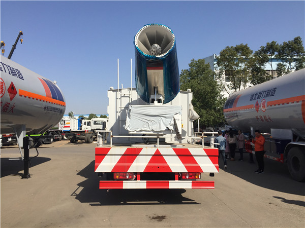 2.爆破抑塵車效率高、射程遠(yuǎn)、覆蓋面積大、水霧且均勻、抑塵效果好。水霧與飄在空中的塵埃接觸時(shí),被塵埃所吸附,加大塵埃的比重,抑制塵埃在空氣中的流動(dòng),并加速塵埃沉降,實(shí)現(xiàn)對(duì)空氣的凈化。