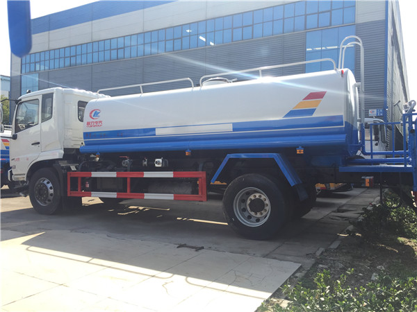 灑水車具有前沖、后灑、側(cè)噴(更換噴頭后變?yōu)閭?cè)花灑)、后置式工作平臺(帶踏梯,四周有安全護(hù)欄)、平臺上設(shè)置有高壓水炮(可360°旋轉(zhuǎn),可調(diào)成柱狀最大射程28米,也可調(diào)成霧狀最大射程14米,可調(diào)成:直沖狀、大雨、中雨、小雨、毛毛雨),整車灑水寬度大于14米.配備優(yōu)質(zhì)大功率專用灑水泵,取力器,雜物過濾網(wǎng),國標(biāo)通用65型消防接口(可通過消防栓加水)、1套自流球閥系統(tǒng)(可自吸自排,最大吸程6米),2根引水鋼絲膠管(帶陰陽快速接頭),配鎖,水位計(jì),作業(yè)高音喇叭.兩側(cè)及后加強(qiáng)型保險(xiǎn)杠,防滑爬梯,膠管儲存筒。