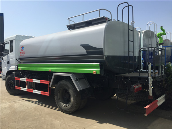 2、新款東風(fēng)專底灑水車標(biāo)配前沖、后灑、側(cè)噴、后工作平臺(tái)、綠化炮、自流閥、消防接口、水位計(jì)各1個(gè),輸水管3米2根,罐體右后上方帶花灑2個(gè)。