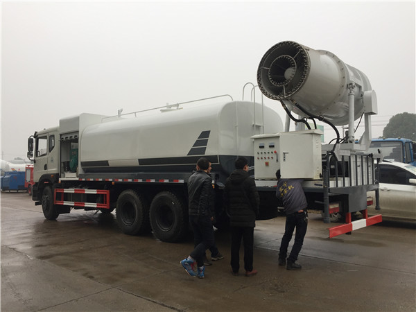 保定用戶購置15噸東風(fēng)T5抑塵車發(fā)車,該車夏季用戶綠化噴灑使用,而且駕駛室前置電動灑水炮,冬季用來運(yùn)輸熱水,一車多功能。