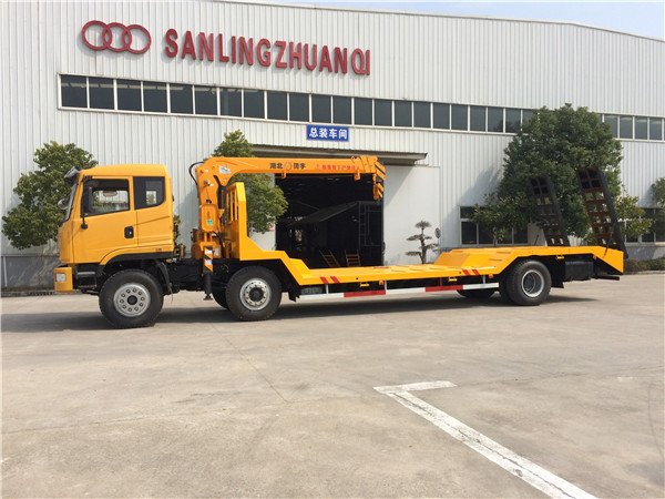 東風(fēng)前四后八凹梁隨車吊,前四后八凹梁隨車吊采用凹梁下沉結(jié)構(gòu)好處在于平板離地高度低重心穩(wěn),專利凹式設(shè)計(jì),凹梁式隨車吊平板車,凹式隨車吊平板車,主要用于30噸左右挖掘機(jī)運(yùn)輸,裝載機(jī)運(yùn)輸,收割機(jī)運(yùn)輸,壓路機(jī)運(yùn)輸?shù)裙こ虣C(jī)械和不可拆卸物體的運(yùn),本產(chǎn)品是我們廠家專利產(chǎn)品,全國有此公告僅此一款,缺點(diǎn)在于凹梁設(shè)計(jì)易斷大梁和前方向拐臂,采用TT530豪華活D913駕駛室,玉柴310馬力國五發(fā)動(dòng)機(jī),5.5噸前橋13噸后橋,法士特10檔變速箱,10.00R20鋼絲胎,方向助力、斷氣剎、abs防抱死、空調(diào),總質(zhì)量31噸,上戶噸位18.45噸,車身自重12.35噸,標(biāo)準(zhǔn)型上裝橫梁采用12*12規(guī)格6mm厚方鋼,整根貫穿式設(shè)計(jì),保證承載性能,貨箱平板10mm厚花紋板;重載型上裝橫梁采用12*10規(guī)格8mm厚方鋼,整根貫穿式設(shè)計(jì),承載性能更好,貨箱平板8mm厚花紋板,爬梯采用重載加強(qiáng)型設(shè)計(jì),采用三道筋雙簧加固處理,帶有后支腿,平板帶有斜支撐,貨箱平板可以伸縮,伸出3米,縮回2.5米,是運(yùn)輸30噸-40噸大型挖掘機(jī)、大型工程機(jī)械等最理想的拖車。