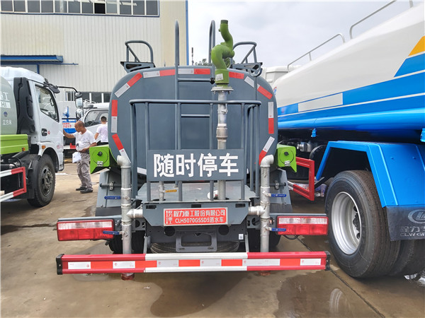 小多利卡5方灑水車(罐體容積:5立方):該車采用東風朝陽柴油發(fā)動機,一汽錫柴柴油發(fā)動機和昆明云內柴油發(fā)動機,白色前翻駕駛室,7.00-16輪胎,汽剎, 5檔變速箱,2噸前橋,4噸后橋,整車外形尺寸:長×寬×高(mm) 5990/1980/2390,總質量(kg)7360,額載質量(kg)3870。罐體有效容積:5噸,帶國家免征公告。
