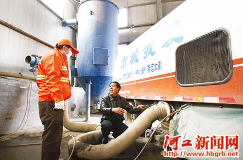 在掃路車(chē)車(chē)廂下裝上一根大管子,直接吸走粉塵、雜物,最大程度地降低揚(yáng)塵現(xiàn)象。近日,在石家莊市橋西區(qū)環(huán)衛(wèi)大隊(duì)粉塵清倒車(chē)間,這臺(tái)巨型“吸塵器”和他的發(fā)明人——環(huán)衛(wèi)大隊(duì)副大隊(duì)長(zhǎng)劉秀江給我們介紹了這臺(tái)掃路車(chē)。