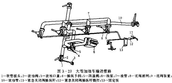 加油車為了具備給受油設(shè)備加油、自吸裝油、循環(huán)攪油,移動泵站作用,吸回加油軟管中的油液等五種功能,輸油管路也較運油汽車復雜,并設(shè)有油泵。圖3-23是一大型加油車的管路系統(tǒng)。該車有四個艙, 每個艙底都裝有一個底閥裝置(見圖3-24),并且為放油方便,在汽車左、右兩側(cè)及尾部各設(shè)置一個放油閥,以便適應車輛在不同方位上時進行加油作業(yè)。