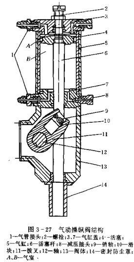 放油閥的操縱形式有手動,液動,氣動和電動等,根據(jù)總布置要求確定,手動形式簡單,在無特殊要求時,一般采用手動,為提高機械化程度,也可采用液動或氣動,液動力源可取本車動力轉(zhuǎn)向系統(tǒng)的壓力油液,氣壓源可取本車制去氣源。電動形式容易引起火災。圖3-27為氣動操縱閥的結(jié)構(gòu),用來操縱放油閥或其它的控制閥,當氣室A充氣,氣室B排氣時,空氣壓力推動活塞4通過活塞桿6滑塊10使拔叉11轉(zhuǎn)動,于是轉(zhuǎn)軸12使放油閥(控制閥)開啟或關(guān)閉。