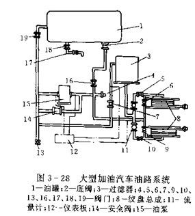 泵進出口之間并聯(lián)了一個安全閥14。過濾器安裝在油泵出油管路上,也可安裝在油泵進油管路上。流量計設(shè)置在油液過濾后的油路上,用于監(jiān)測加油量。為了監(jiān)測主要部件的工作情況和某些加油性能,在油路上可設(shè)置一些監(jiān)測儀表。如在油泵出口安裝壓力表,監(jiān)測油泵的工作壓力,在油泵進油口安裝無休止空壓力表,監(jiān)測油泵進口真空安裝大小隨時掌握油泵的工作情況,在過濾器上安裝壓差表,監(jiān)測過濾器進出口壓力差,基壓差大于某一值,表示濾芯已堵塞,應立即進行清理,若壓差小于另一值,表示濾芯已被擊穿,則應更換。操縱各種閥門的開啟或關(guān)閉實現(xiàn)上述五種功能。當開啟閥門5、7、10、16時,罐中油液經(jīng)油泵、 管道、閥7、過濾器3、流量計11、閥10或5給受油容器加油;當開啟閥門16、19時,罐內(nèi)油液經(jīng)閥16、油泵15、閥19返回油罐進行內(nèi)部循環(huán),攪勻罐內(nèi)油液,當開啟閥4、13時,可起泵站作用,即將油庫或其它貯油設(shè)備的油料經(jīng)本車油泵輸給受油設(shè)備,當開啟閥4、19時,為本車油罐自吸裝油。閥17、18用來排放罐內(nèi)的水分和沉淀的雜質(zhì)。