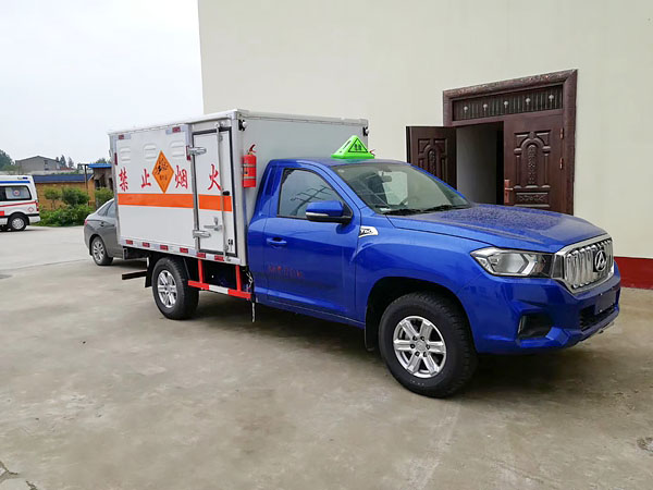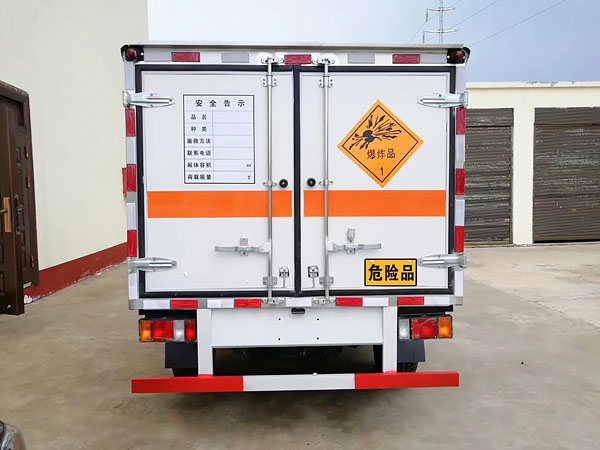廂體全金屬整體骨架結(jié)構(gòu),外飾冷軋鋼板(隔熱,防靜電),內(nèi)飾鋁板(隔熱,防靜電),中間骨架結(jié)構(gòu)(提高廂體強(qiáng)度),所有箱板內(nèi)部填筑阻燃高強(qiáng)度泡沫板整體高壓粘合鉚接后焊接拼裝成廂型,底板鐵板上鋪設(shè)防靜電膠皮(絕緣,導(dǎo)靜電),前臉底部鋁板上加裝靜電防撞膠皮,內(nèi)飾臥環(huán)(固定貨物定位拉環(huán)),透氣孔,外部帶通風(fēng)孔,保持廂體與外部空氣流通,及時(shí)與外部空氣交換,確保安全,大梁加裝拖地靜電膠帶,把貨物摩擦靜電導(dǎo)入大地。車輛門框配備防盜報(bào)警器,廂內(nèi)頂部安裝煙霧報(bào)警器,前廂板左右立柱安放滅火器,排氣管前置安裝排氣火花熄滅器,駕駛室安裝“危險(xiǎn)品”標(biāo)志燈,車廂外中部粘貼橙色反光帶一周,并在車廂左、右、后安裝“爆炸品”菱形牌3塊,車體后部設(shè)置安全告示牌、“危險(xiǎn)品”黃色警示牌,后保險(xiǎn)杠安裝緩沖加強(qiáng)橡膠塊等。車廂開側(cè)門,方便裝卸貨物;可加開隔倉,方便不同性質(zhì)的爆破物品同車分倉運(yùn)輸。